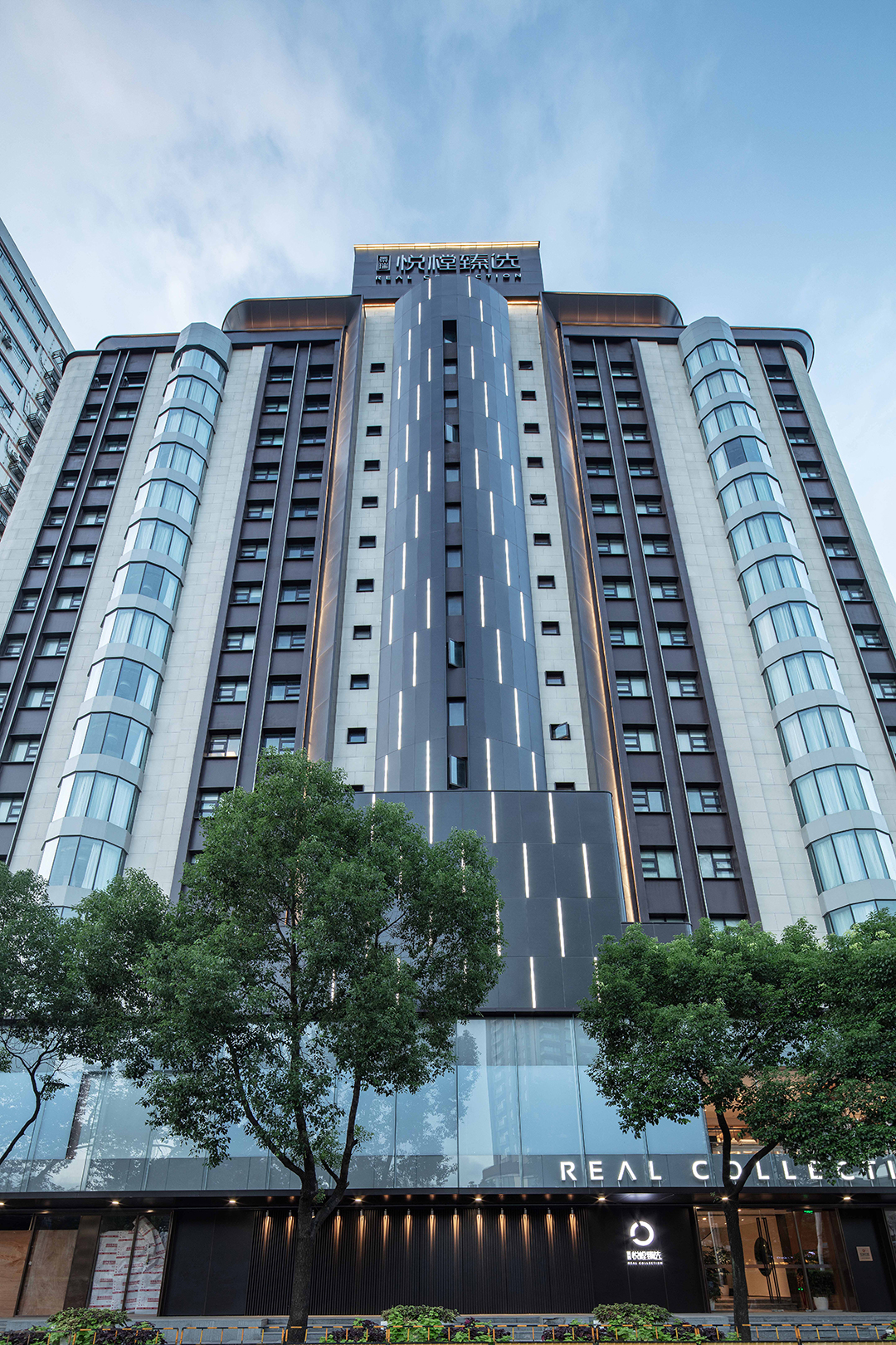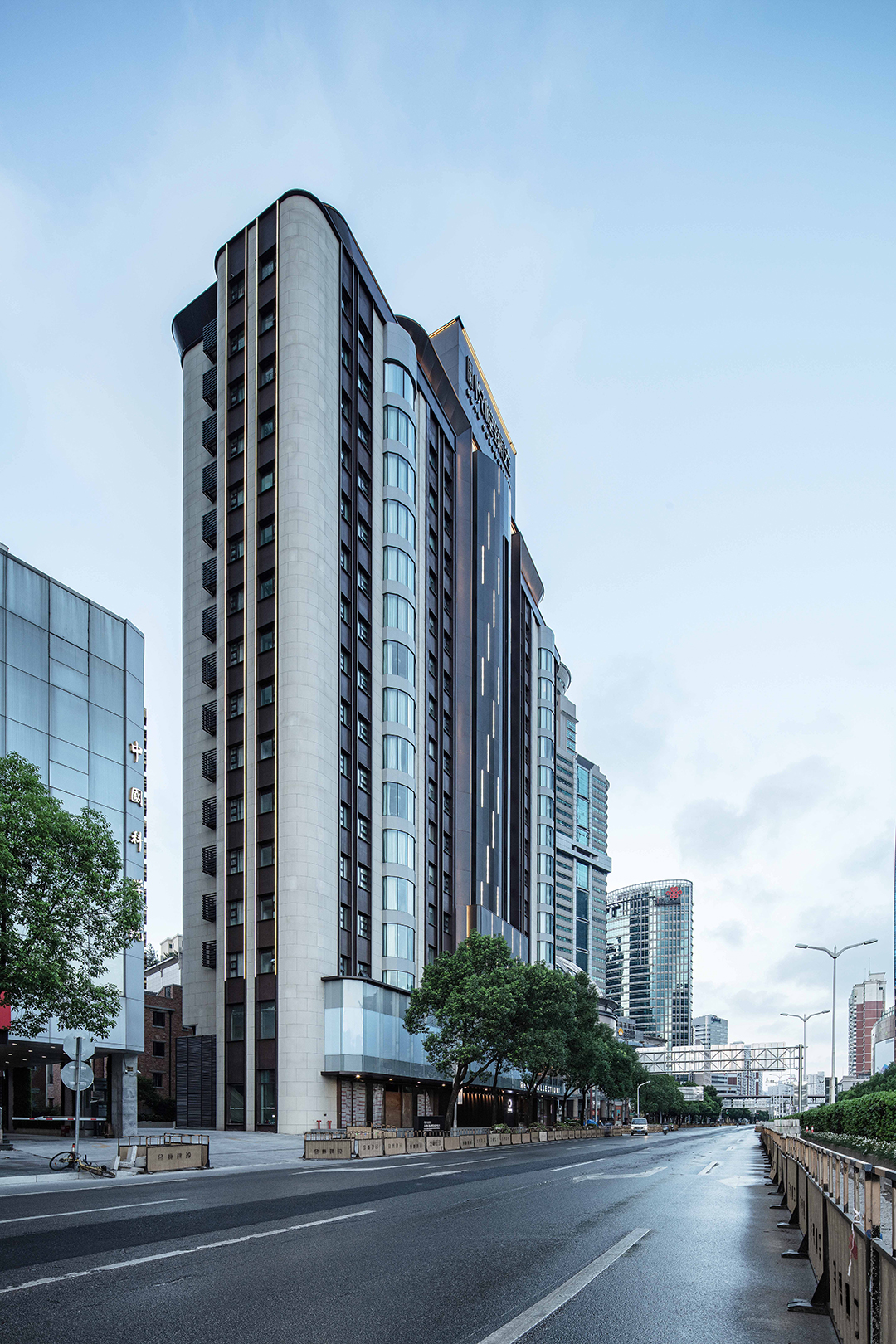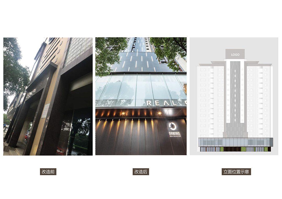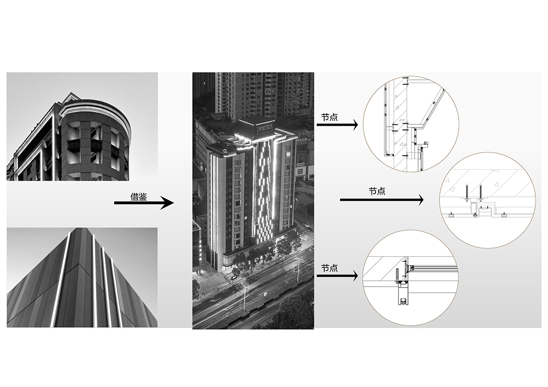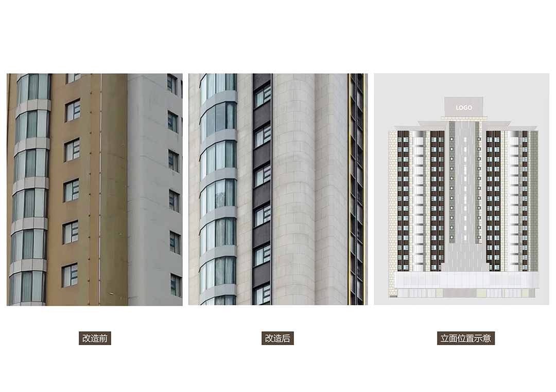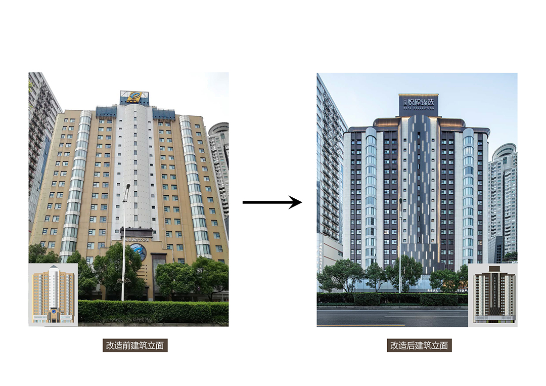 鏟掉老舊的黃色墻面漆,用白色真石漆代替,淺色的石材紋理和深色金屬形成對比,簡單而莊重的立面效果和酒店功能完美結(jié)合。燈光則置于豎條凹槽內(nèi),夜間效果明顯,且使建筑與周邊繁華的現(xiàn)代街區(qū)相統(tǒng)一。