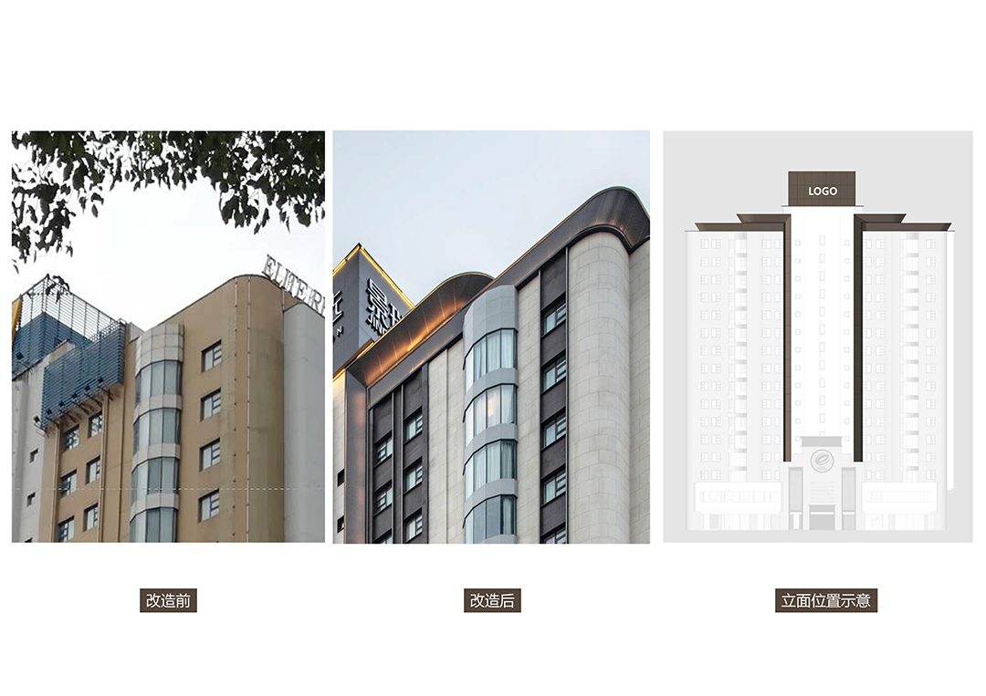 在不動原建筑結(jié)構(gòu)的基礎(chǔ)上,拆除豎向附墻柱頂部無用的拱形部分,采用金屬質(zhì)感涂料重新噴涂,同時(shí)立面窗洞兩側(cè)采用金屬線條裝飾,增強(qiáng)建筑的豎向元素,立面透視效果更為挺拔。