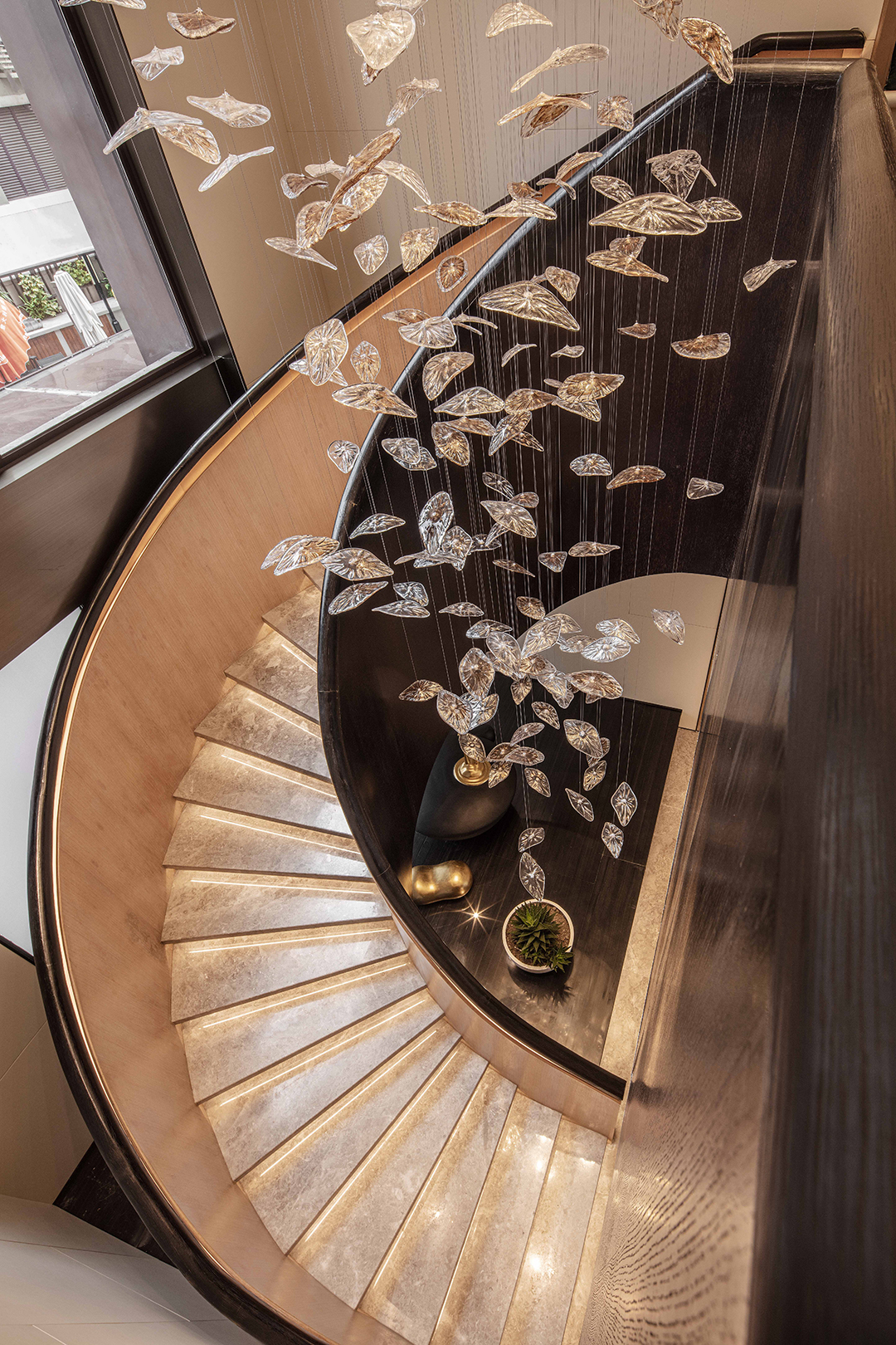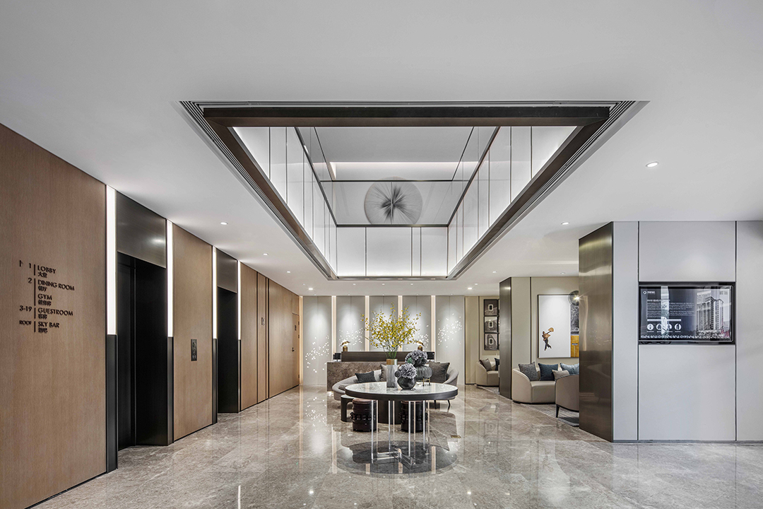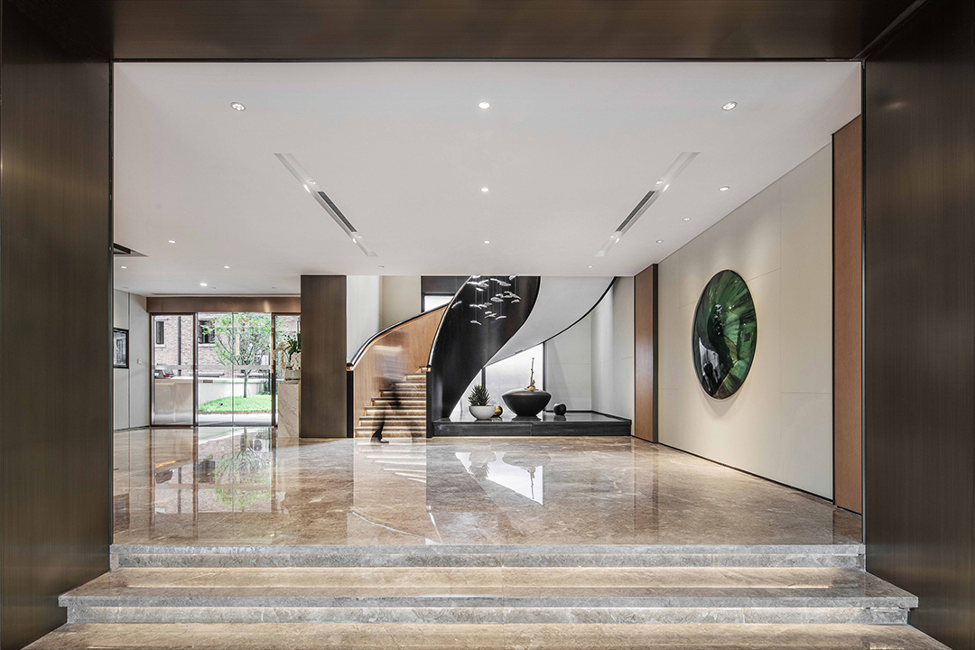 一層Lobby釋放了原有門廳空間,旋轉(zhuǎn)樓梯的特殊造型及藝術(shù)品就成為了門廳入口的對景。中間雙層挑空提供了更為舒適的休息區(qū)域,充足的陽光和四季變換的庭院景觀給住戶增添了家的溫馨。