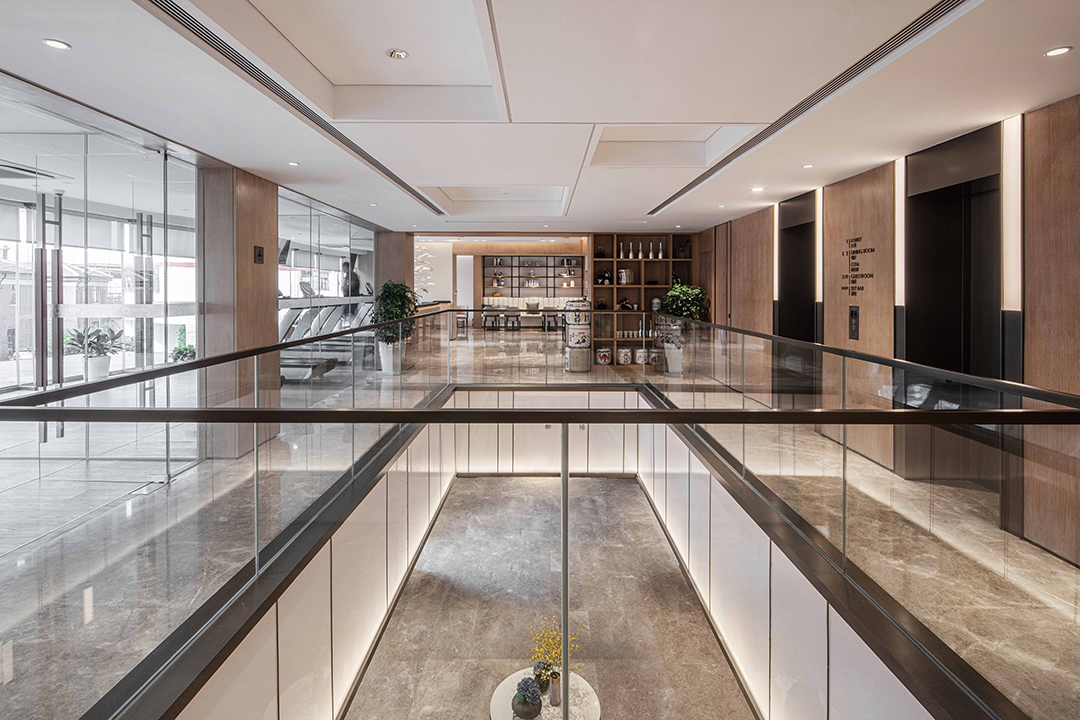 圍繞挑空區(qū)的環(huán)形走廊,更好的將一二層進(jìn)行空間互動。健身房的全鏡面設(shè)計(jì),增加視覺空間感,墻、頂、地面的嵌入式LED燈所形成的框型折線,更加有現(xiàn)代科技感,使用大量鏡面亦將室外風(fēng)景帶入室內(nèi)。同時(shí)可以透過全玻璃俯瞰內(nèi)庭院花園的精致。