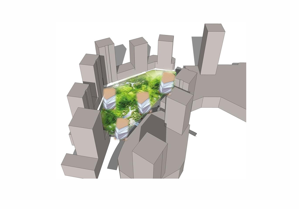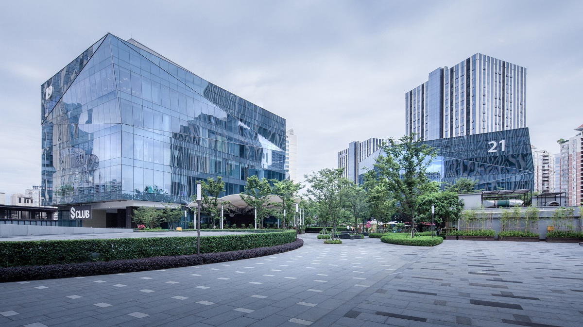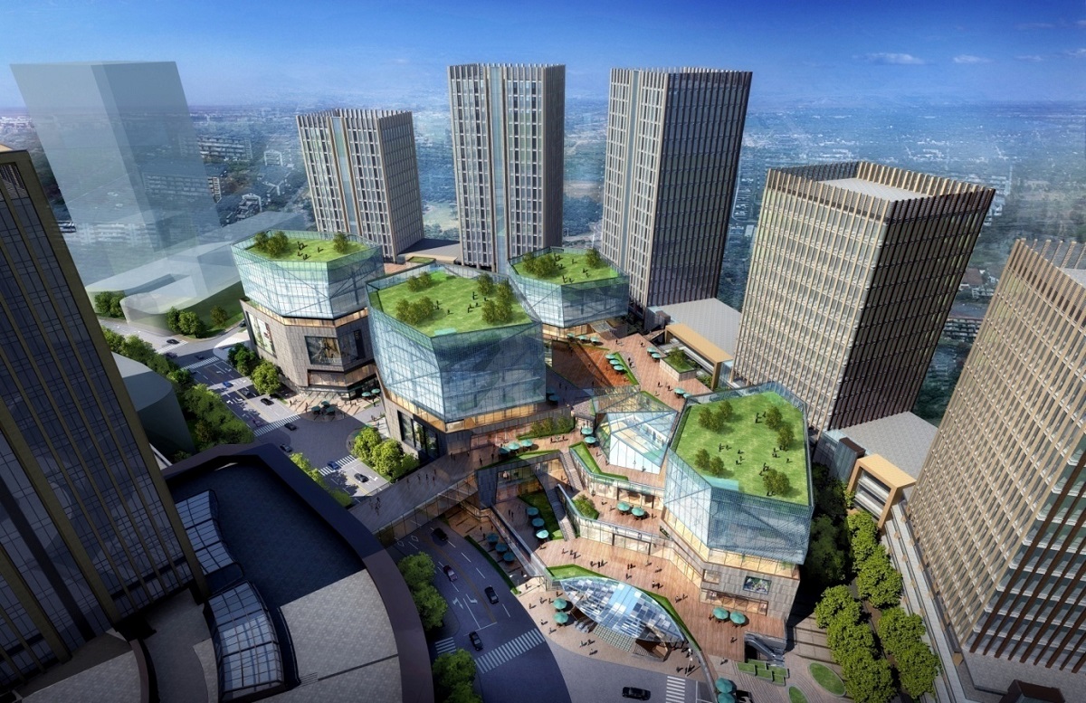 四個冰晶盒子將商業(yè)設(shè)備設(shè)置在屋頂,從高處俯瞰無一不是一處城中花園。裙樓屋頂花園的設(shè)計,不僅美化了整個商業(yè)立面形象,還形成了第五個立面。