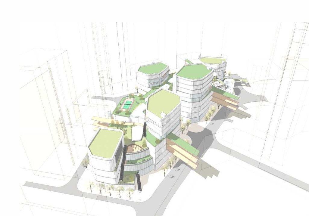 項目共分為四期,由一條主動線貫穿于商業(yè)體之間,形成道路與建筑體的共存,產(chǎn)生暢通的車流與人流。整體布局為公園式商業(yè),四周塔樓圍繞,形成圍合的肌理關(guān)系,連續(xù)的空間,起伏的造型,變化的細(xì)部,視覺效果驚喜不斷。為了實現(xiàn)可持續(xù)發(fā)展,我們使廣泛的公共設(shè)施區(qū)域彼此緊密聯(lián)系,且明確定義和組織,遍布在功能豐富的戶外空間周圍。