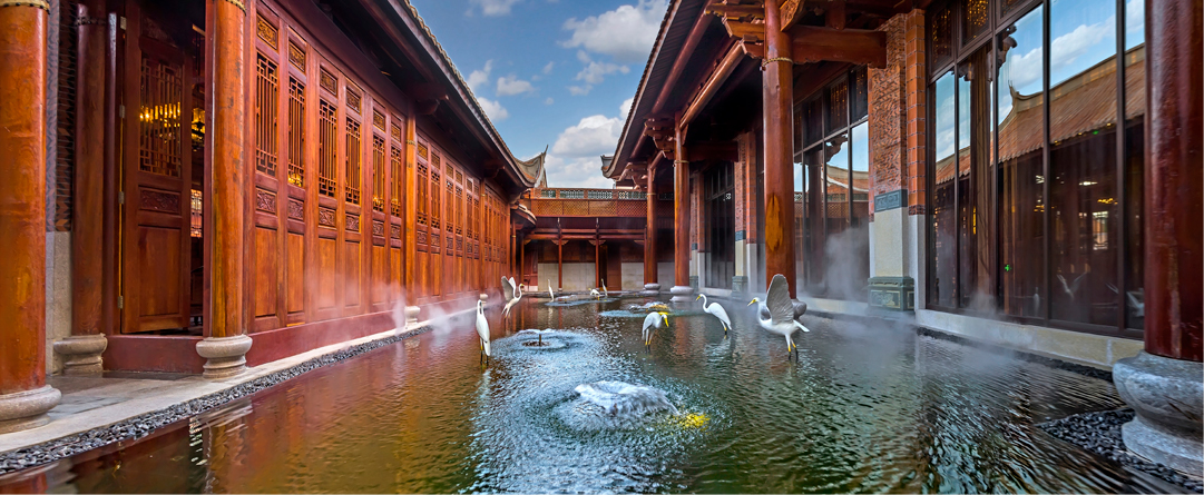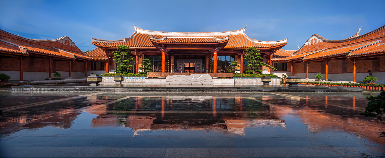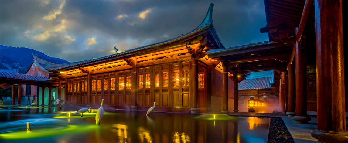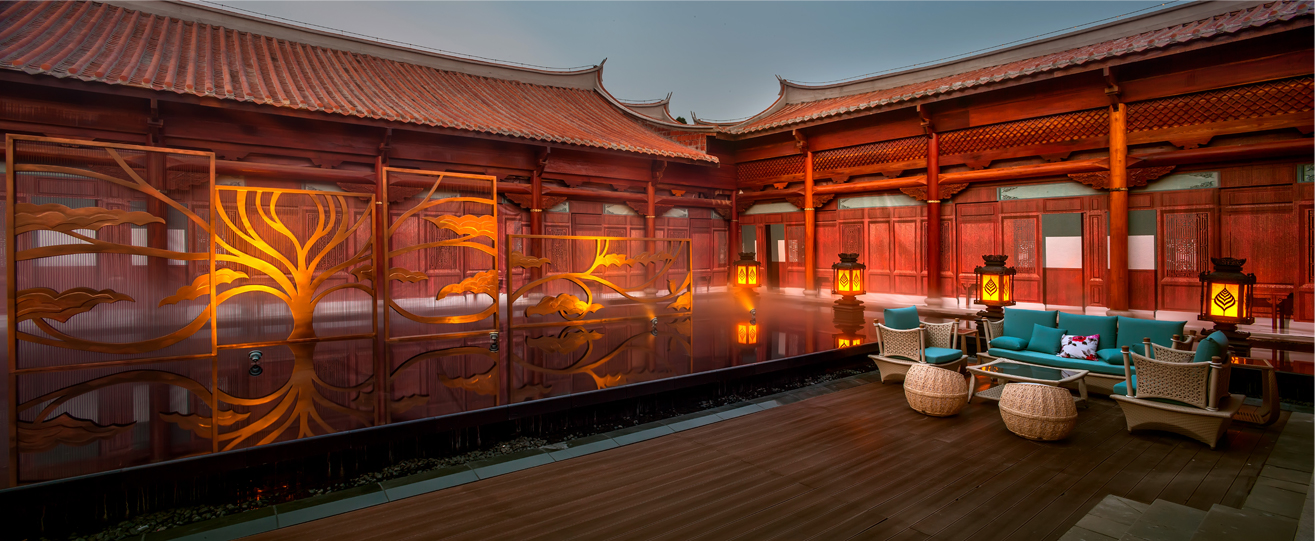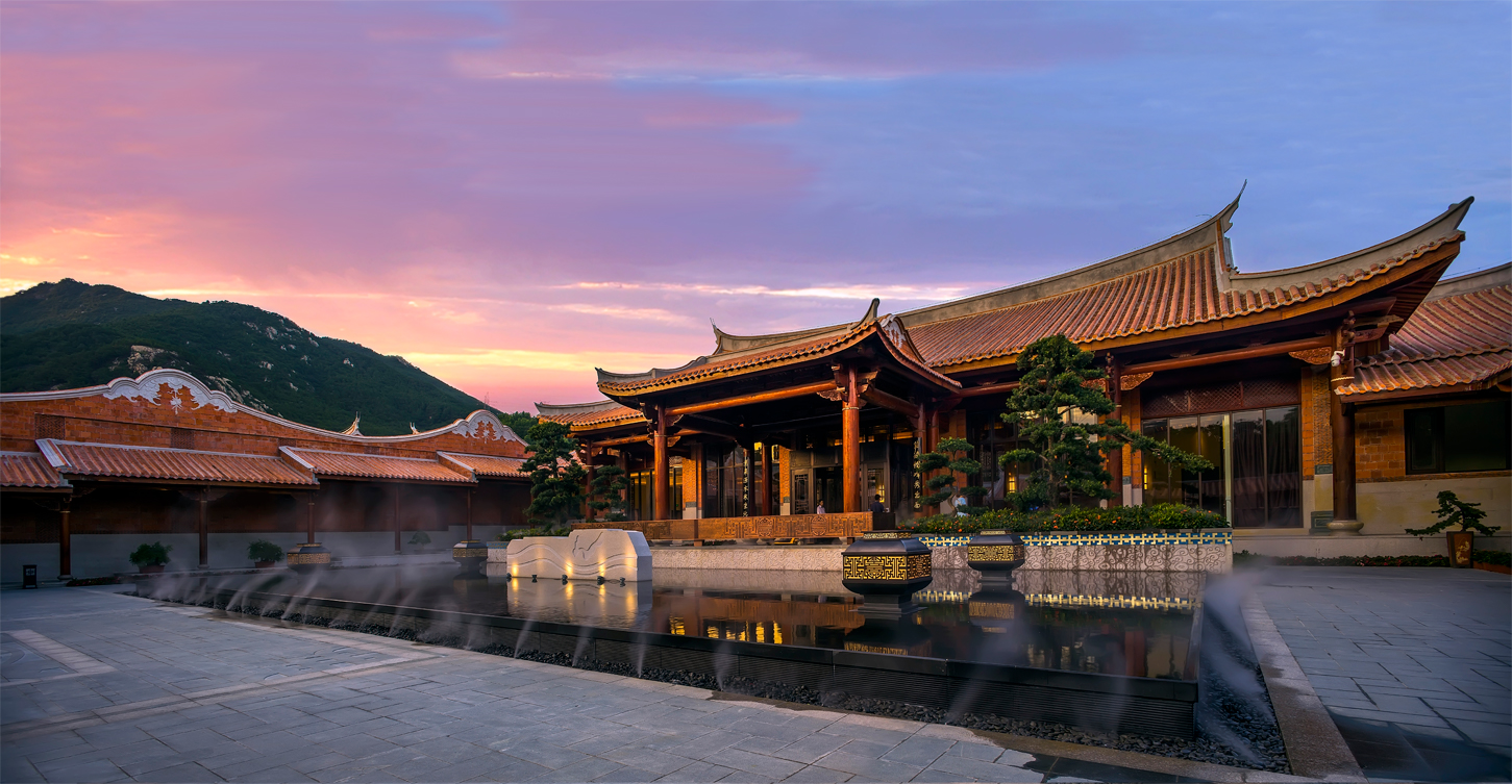 項目位于紫湖水庫的西北面,有“紫帽凌霄”之譽(yù),緊鄰紫帽山風(fēng)景區(qū),坐落在晉江市的北側(cè)。酒店的建筑立面參考了泉州當(dāng)?shù)氐墓偈酱筘?,充分運用了燕尾脊,紅磚墻,青石等傳統(tǒng)建筑元素。木材與石材為主要的建筑材料,成功運用其特性,體現(xiàn)了對地方建材的尊重。通過“厝”與“院”的提取和重組,創(chuàng)造出一種具有閩南意味的中式空間。