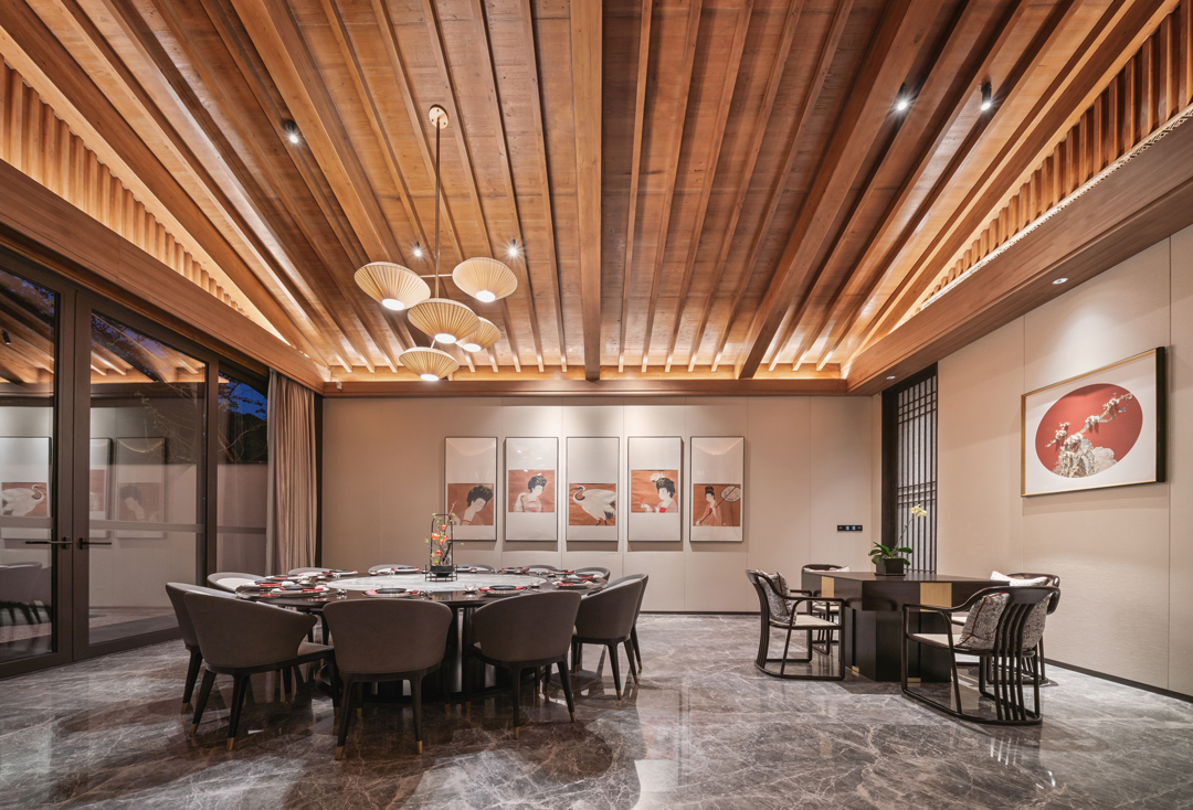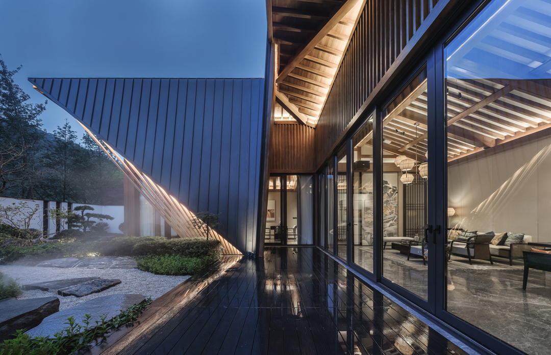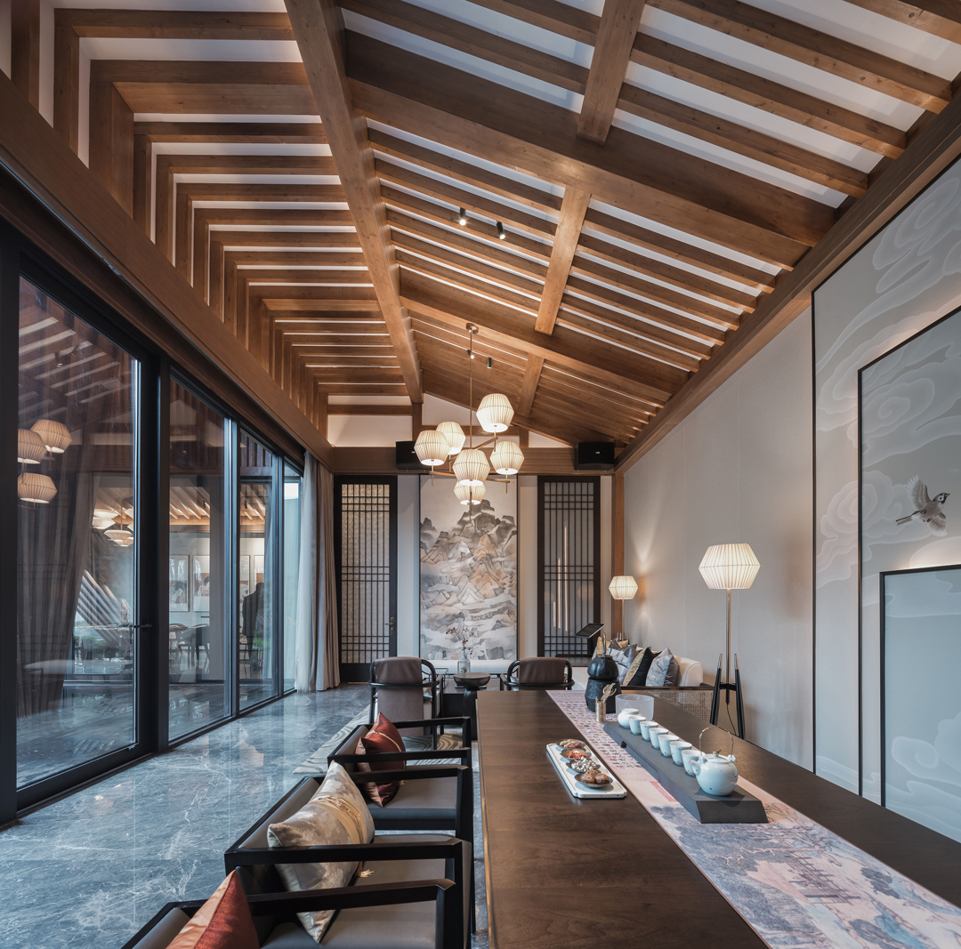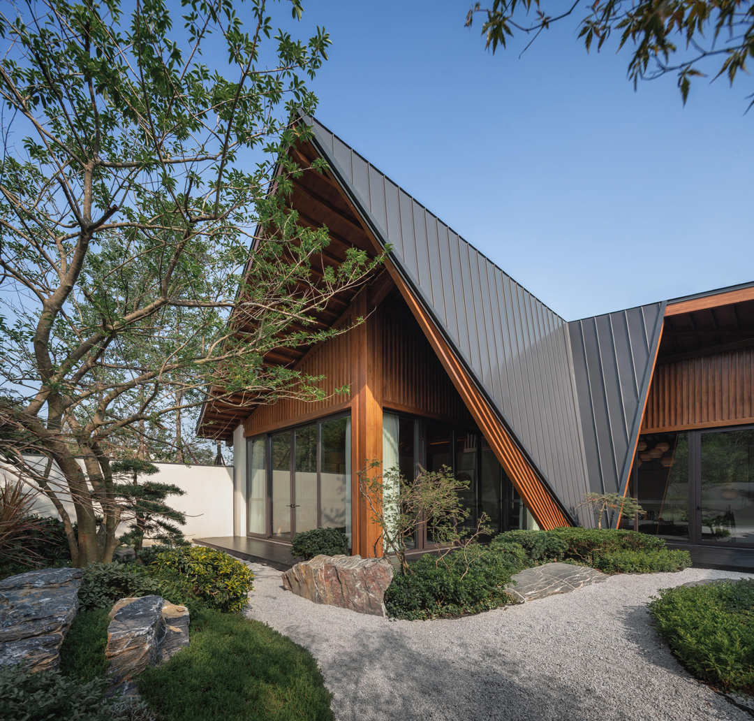 整個(gè)建筑空間層層漸變,屋頂高度根據(jù)功能空間的不同而變換,SPA作為最為私密的空間,屋頂落低,但動(dòng)與靜互為補(bǔ)充,相輔相成。