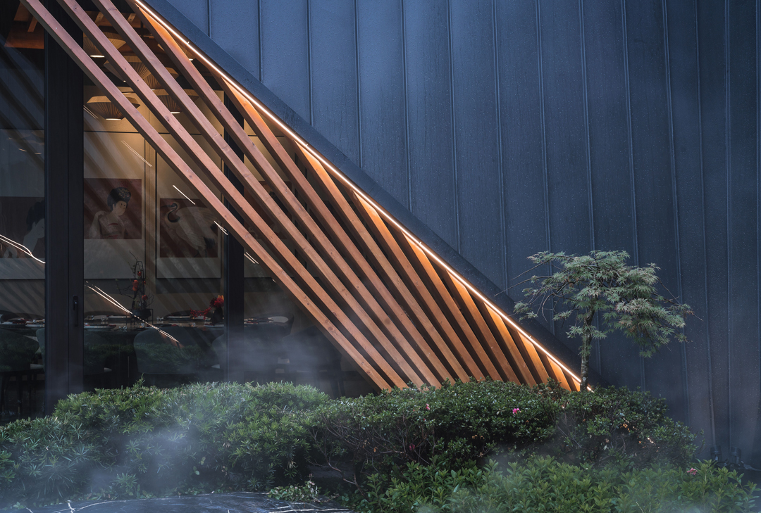 用玻璃與木格柵分割室內(nèi)外空間,引導(dǎo)視線,借以北側(cè)遠(yuǎn)山,分別形成三面框景。無(wú)聲、有光、有影,建筑元素越是接近世界的本原,人越能與空間產(chǎn)生共鳴,皆在營(yíng)造鬧中取靜的空間氛圍。