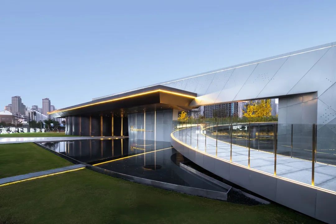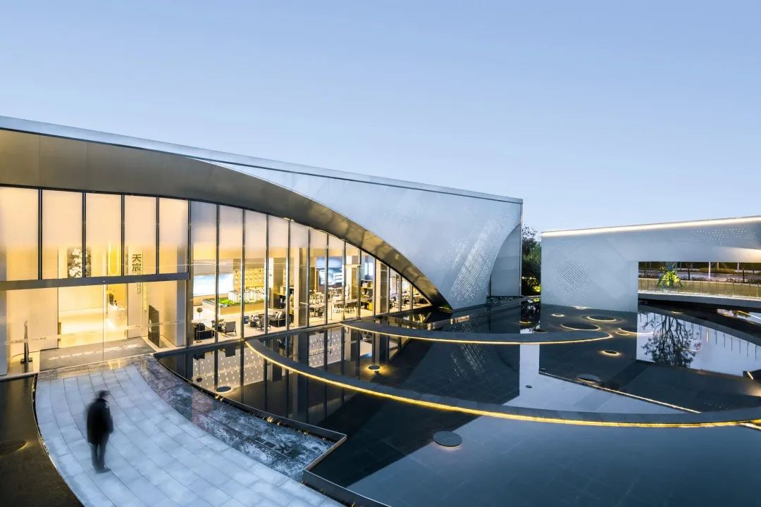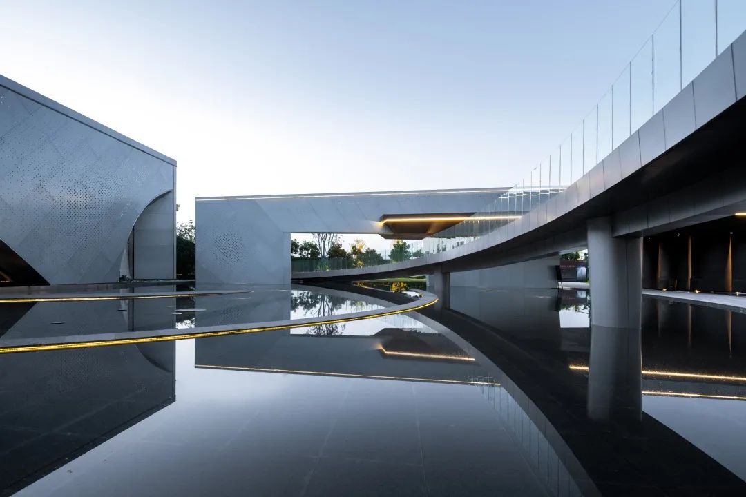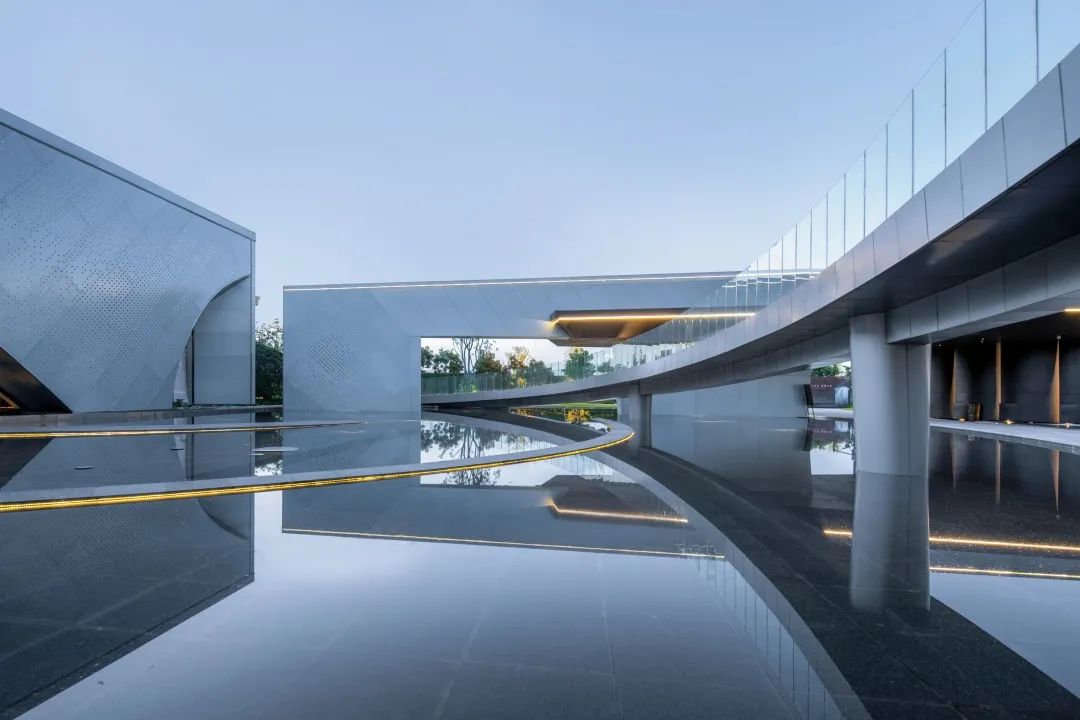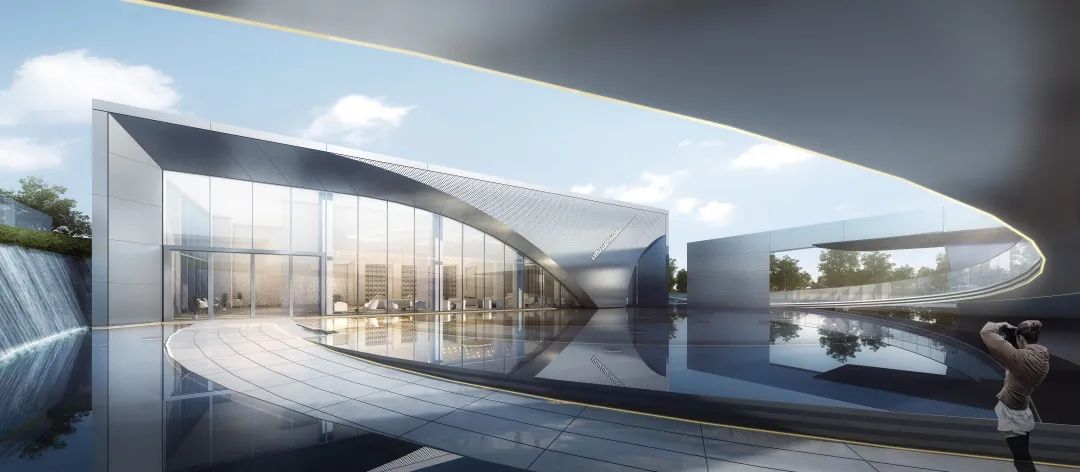 獨(dú)特的示范區(qū)入口門頭設(shè)計(jì),三角形交錯(cuò)切割搭的頂蓋搭配弧與圓變形拼接的墻體,選用與建筑表面相同的鋁板材質(zhì),讓每一個(gè)到訪的客戶都能體會(huì)到尊貴大氣的儀式感。大門整體框架為線條設(shè)計(jì)感十足的多邊幾何形,肆意張揚(yáng)的角,似無(wú)限延伸的線,百變的面富有動(dòng)感?!坝?、“聚”、“觀”一氣呵成。整體為黑白色調(diào),純粹簡(jiǎn)約,同樣不缺少高級(jí)質(zhì)感。從內(nèi)延伸至外的水面,倒映著藍(lán)天白云,似天地顛倒闖入一片幻境,似夢(mèng)而非夢(mèng)。