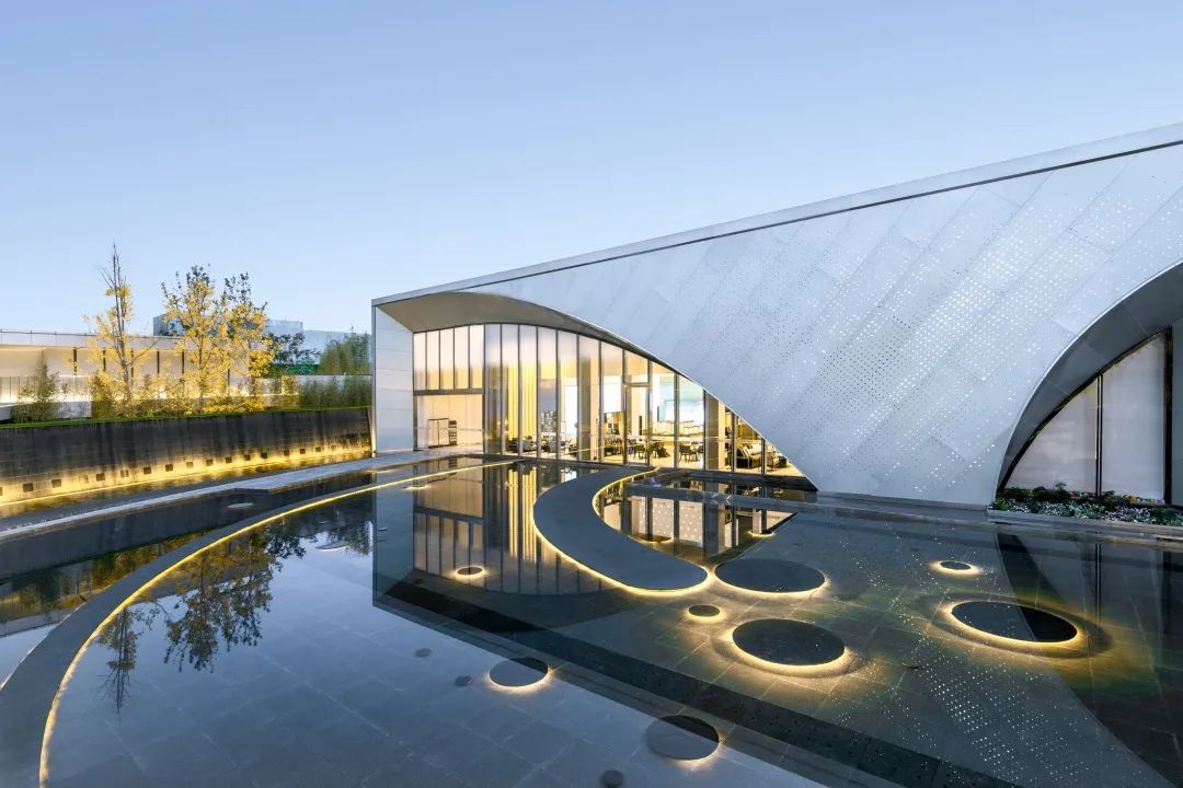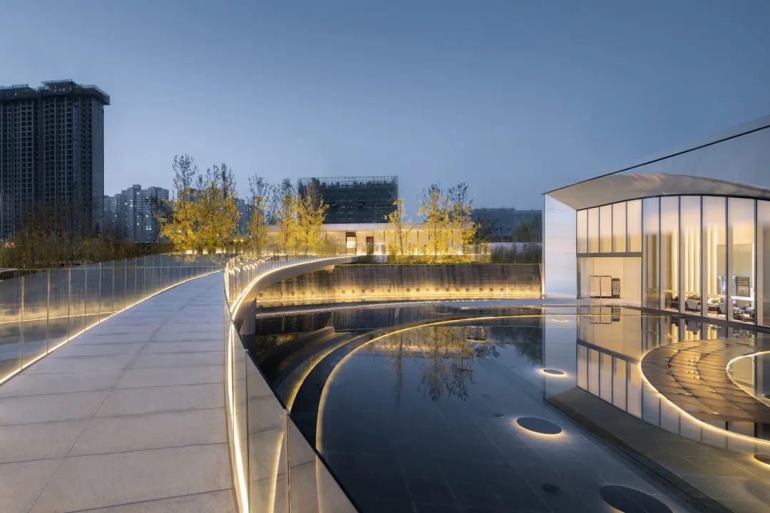 空間與視覺的連續(xù)性:立面的墻體通過藝術(shù)創(chuàng)作產(chǎn)生視覺上的肌理感,將光與影帶入到空間中,微風(fēng)拂過水波倒影連廊起伏,層層漣漪之上倒映出朦朧的樹影與建筑。運(yùn)用玻璃等半透明材料,舒朗別致的造型結(jié)構(gòu)打破景觀與建筑的界限,打造空間與視覺的連續(xù)性與純凈性。