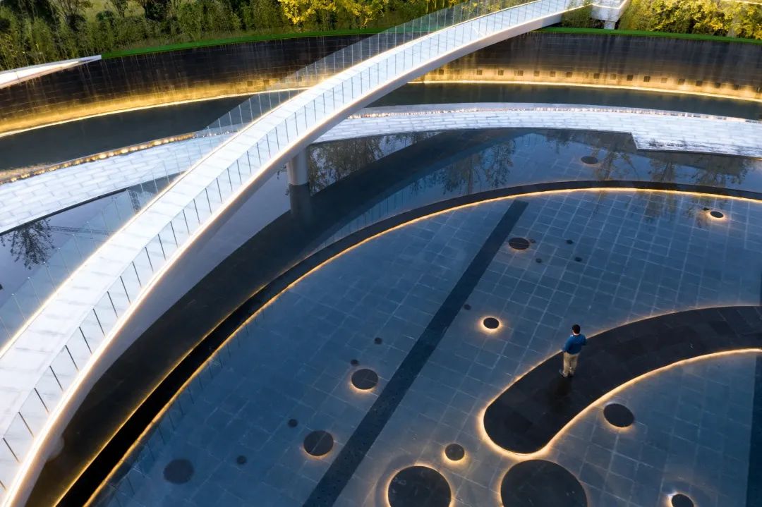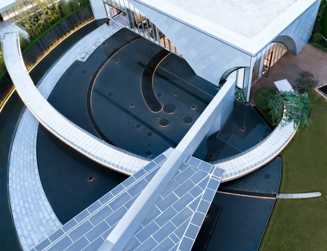 曲線形和方形的空間,與景觀的廊橋相互回應(yīng)。建筑立面的曲線與景觀廊橋的曲線延續(xù)統(tǒng)一,這是一條隱性的認(rèn)知流線——向上、向內(nèi)、向光,懸隔日常,劃過銀河,回歸自我。