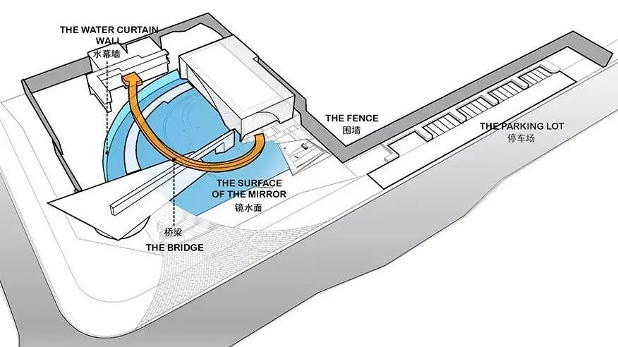 進(jìn)入場(chǎng)地后的主要觀賞空間是眼前的大面積鏡面水景,水景往往給人無(wú)限延伸的神秘感和想象力。通過水景人們可以看到周圍的每時(shí)每刻變化,她如同媒介,搭起了人與自然溝通的橋梁。