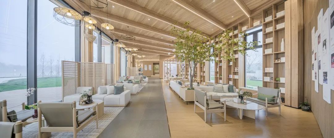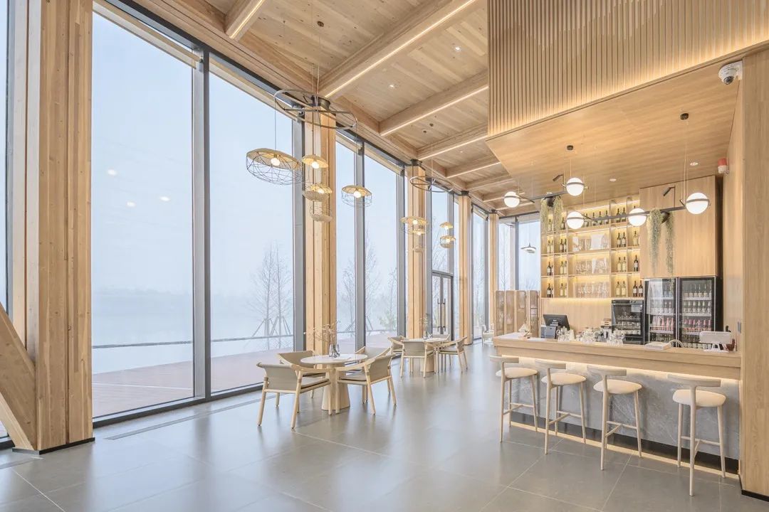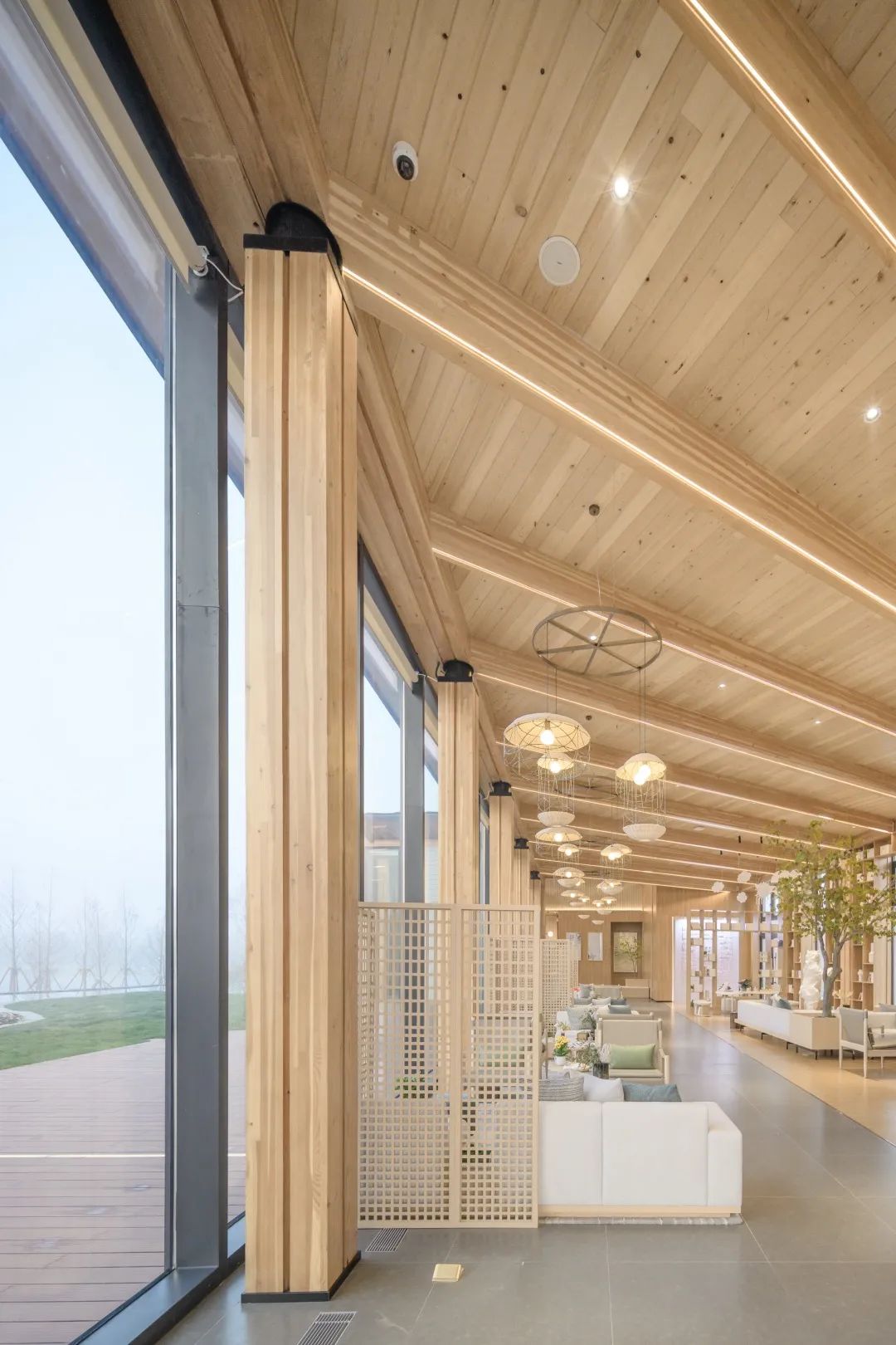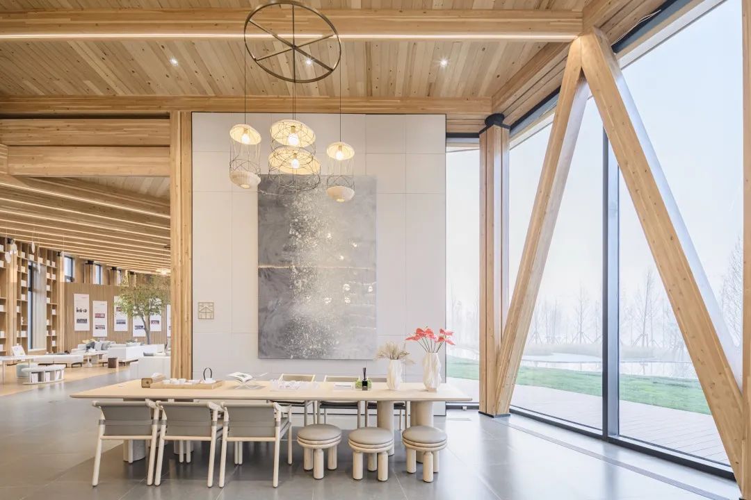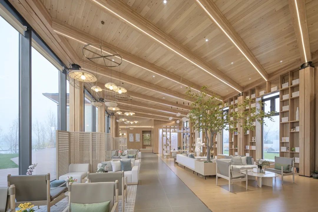 項(xiàng)目著重體現(xiàn)自然、田園、舒適的空間氛圍,重點(diǎn)詮釋木結(jié)構(gòu)空間完整性和體現(xiàn)木結(jié)構(gòu)梁柱的序列感,通過(guò)開敞的空間布局方式,營(yíng)造出空間與建筑之間統(tǒng)一性,體現(xiàn)木結(jié)構(gòu)空間張力與自然美學(xué)氛圍。